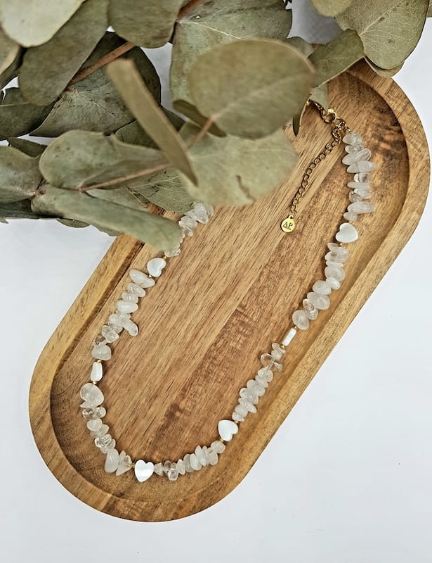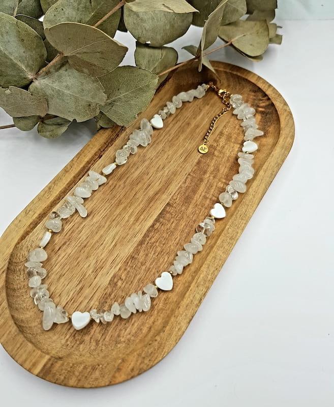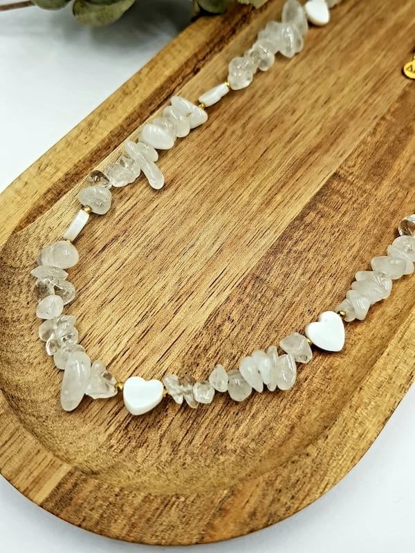 Ręcznie wykonany naszyjnik z kryształem górskim w naturalnej formie sieczki, uzupełniony masą perłową w kształcie serca i delikatnymi złotymi akcentami. Subtelna biżuteria z kamieni naturalnych, stworzona z myślą o lekkości, harmonii i codziennym komforcie noszenia.