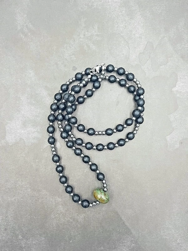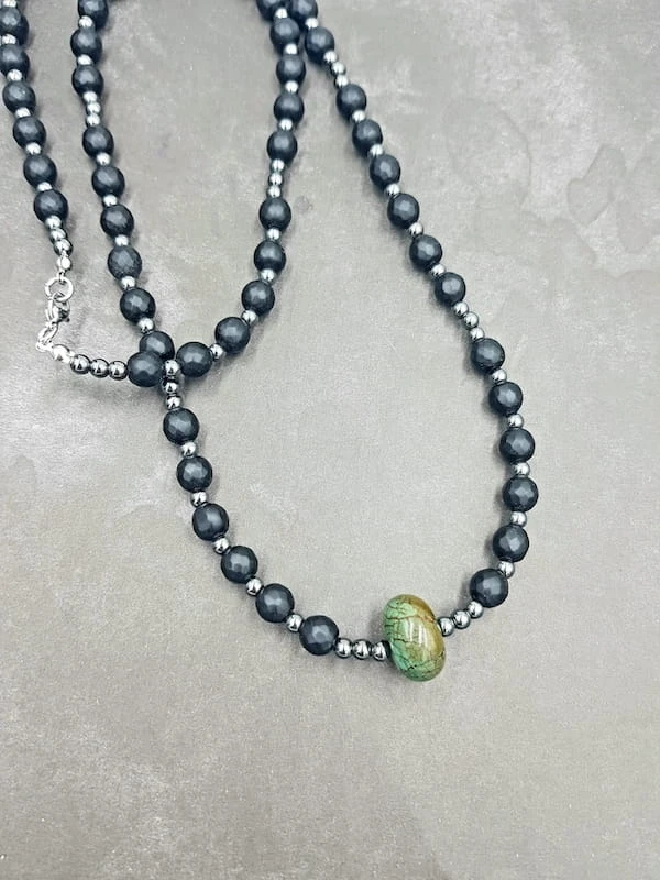 Męski naszyjnik z lawy wulkanicznej, hematytu i jaspisu to kompozycja oparta na kontrastach faktur i naturalnej kolorystyce. Gładkie, fasetowane kulki matowej lawy wulkanicznej o średnicy 8 mm tworzą spokojną, rytmiczną bazę, którą uzupełnia grafitowy hematyt o wielkości 4 mm. Centralnym akcentem jest prostokątny element jaspisu o wymiarach 21 × 8 mm, nadający całości wyrazistego, ale nadal stonowanego charakteru.