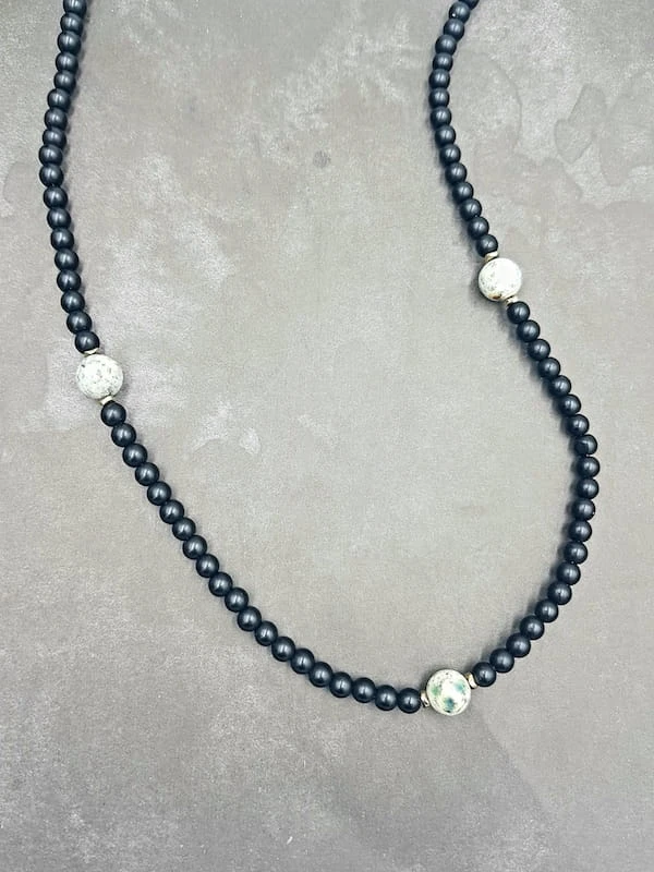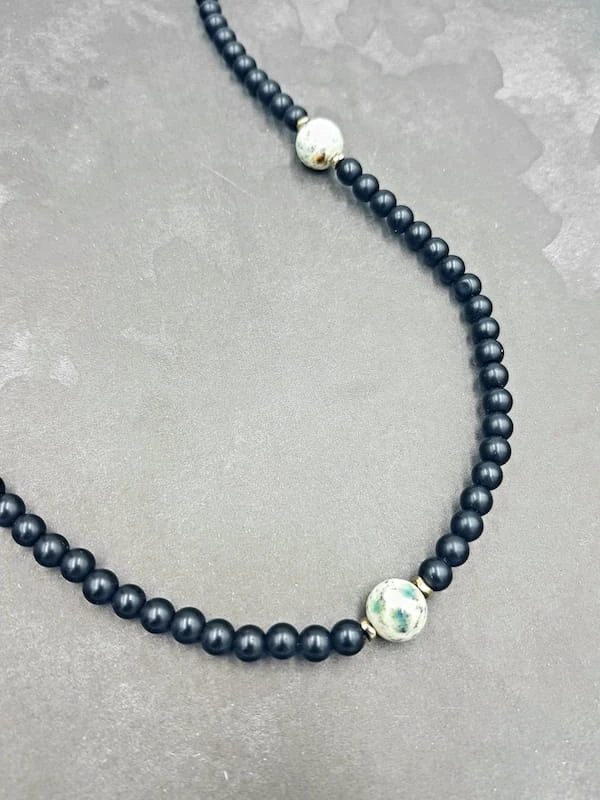 Męski naszyjnik z lawy wulkanicznej, jaspisu i złotego hematytu to kompozycja oparta na kontrastach faktur i naturalnej kolorystyce. Drobne, gładkie kulki lawy wulkanicznej o średnicy 5 mm tworzą stonowaną bazę, którą przełamuje większy element jaspisu o wielkości 12 mm, nadający całości wyrazistego, ale zrównoważonego akcentu.