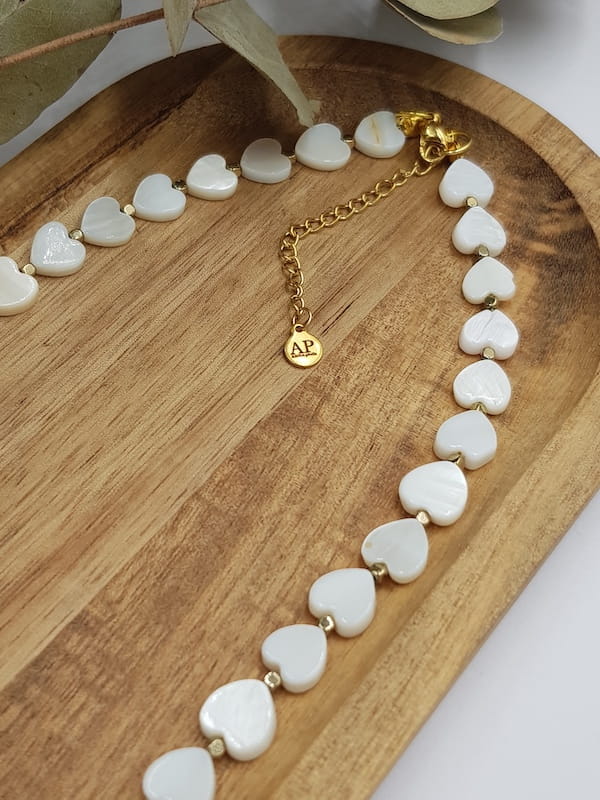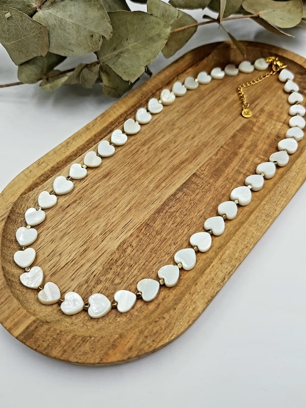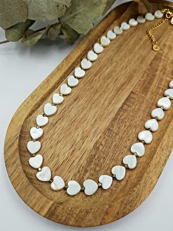 Ręcznie wykonany naszyjnik z drobnymi sercami z masy perłowej, uzupełniony kostkami hematytu w złotym kolorze. Subtelna biżuteria z kamieni naturalnych o lekkiej, spokojnej estetyce, zaprojektowana z myślą o codziennym komforcie noszenia.