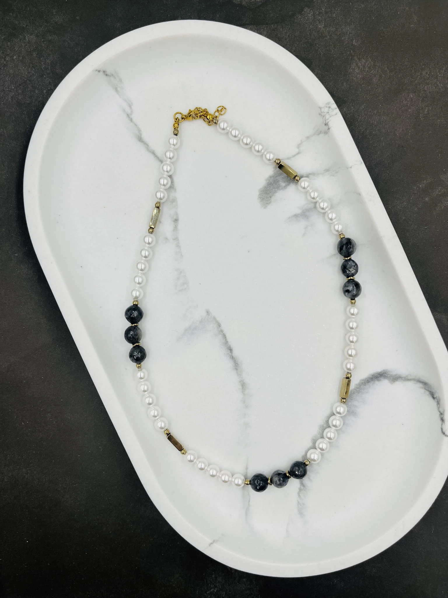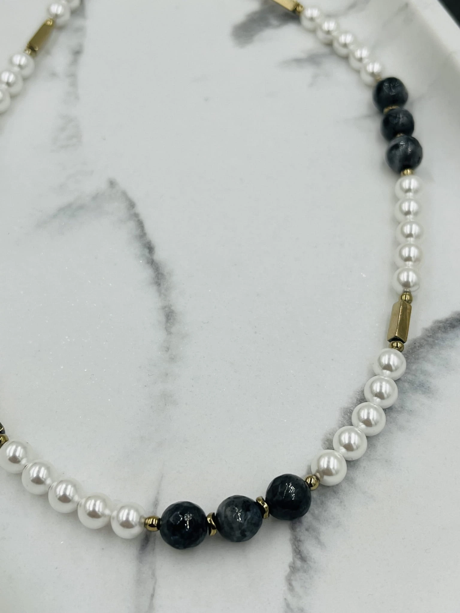 Ręcznie wykonany naszyjnik z perły Majorka, labradorytu i złotego hematytu. Elegancka biżuteria o spokojnym, wyważonym charakterze, łącząca klasyczną perłę z naturalnym kamieniem o subtelnym połysku.