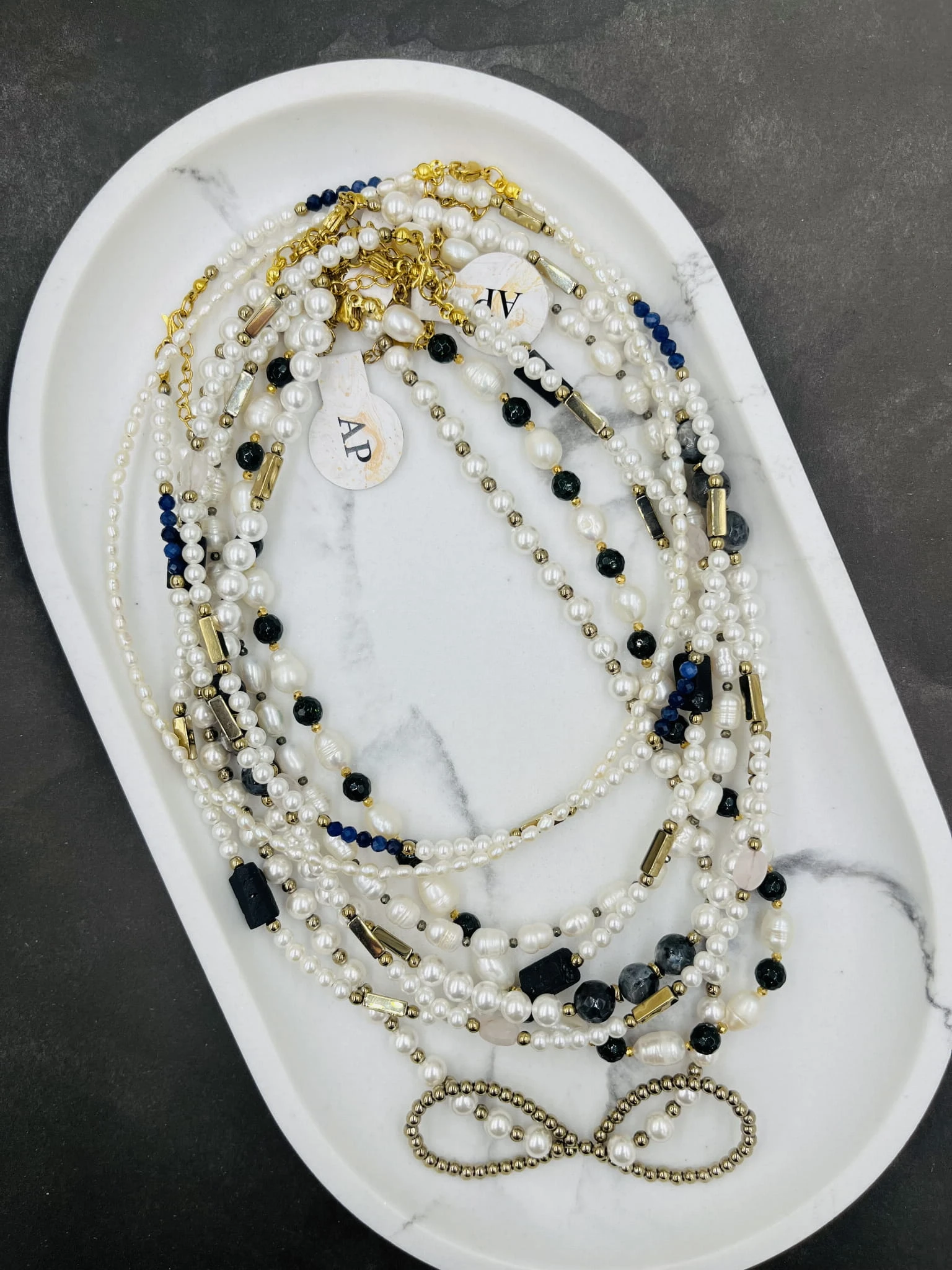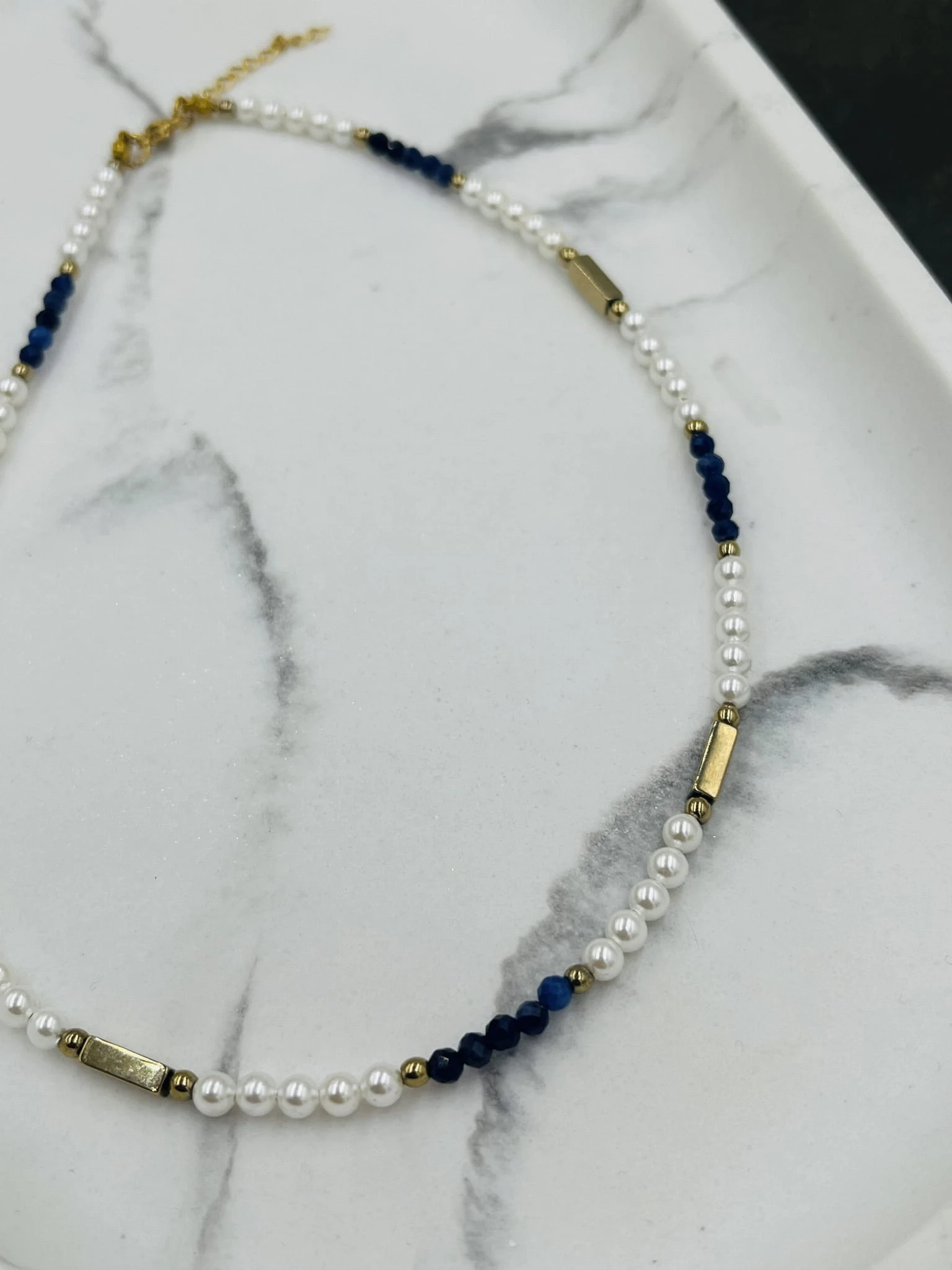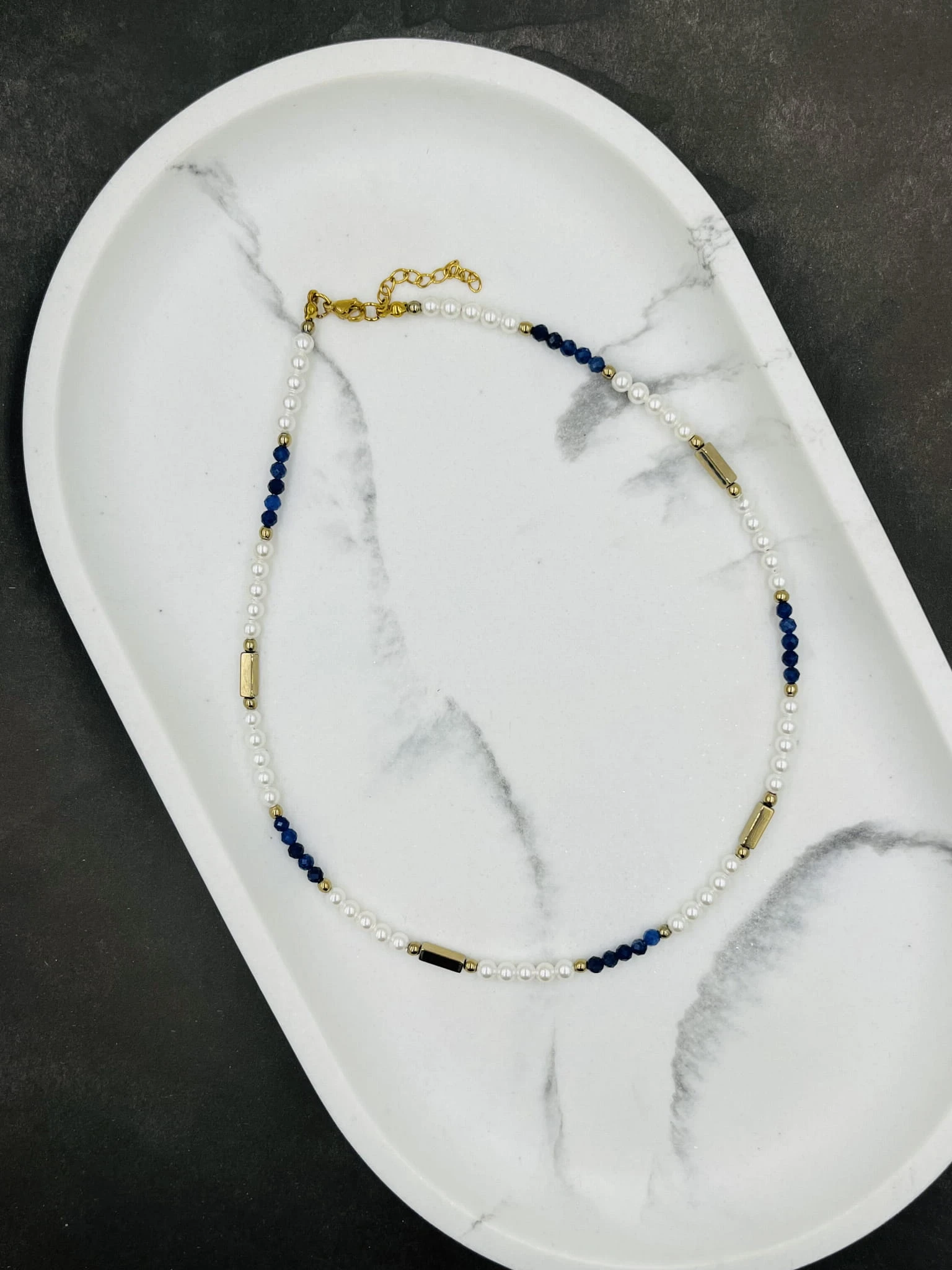 Ręcznie wykonany naszyjnik z drobnych pereł Majorka, lapis lazuli i złotego hematytu. Elegancka, naturalna biżuteria o spokojnym charakterze, łącząca klasyczną jasność perły z głębokim odcieniem niebieskiego kamienia.