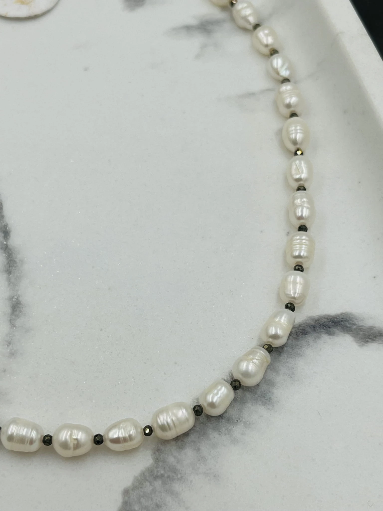 Naszyjnik z perły słodkowodnej i pirytu to harmonijne połączenie klasycznej delikatności z naturalnym połyskiem kamienia. Perły słodkowodne o nieregularnym kształcie nadają kompozycji lekkości i organicznego charakteru.