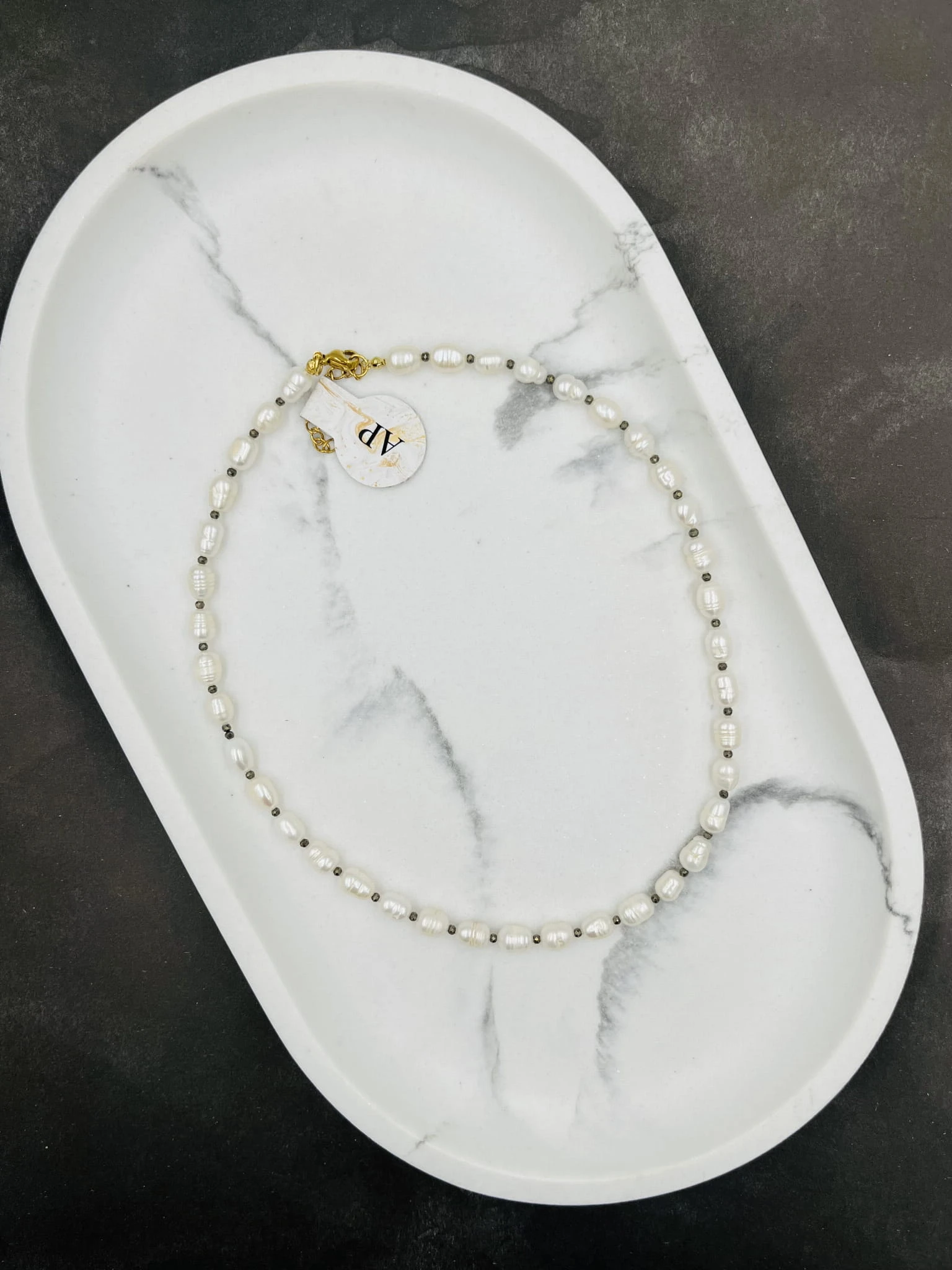 Ręcznie wykonany naszyjnik z nieregularnych pereł słodkowodnych i drobnego pirytu. Subtelna biżuteria o naturalnym, eleganckim charakterze z delikatnym, złotawym akcentem.