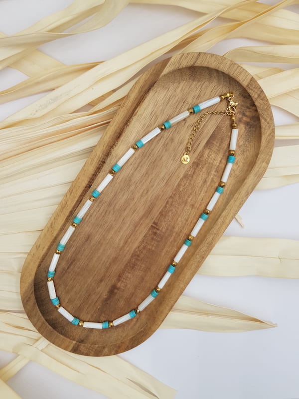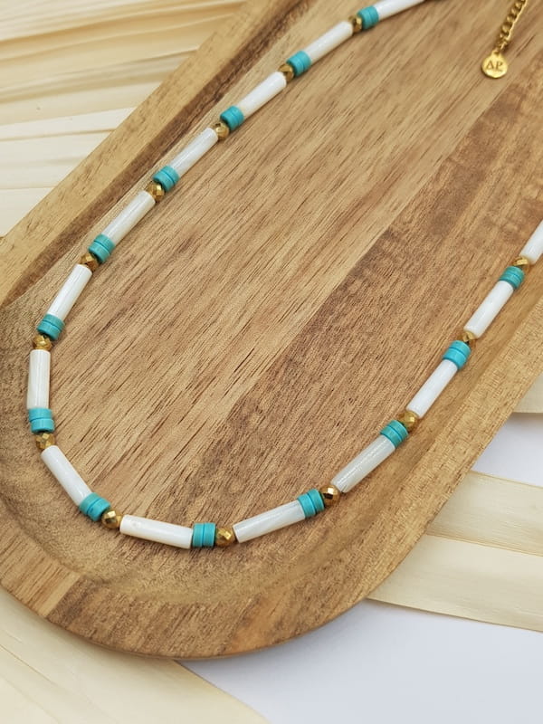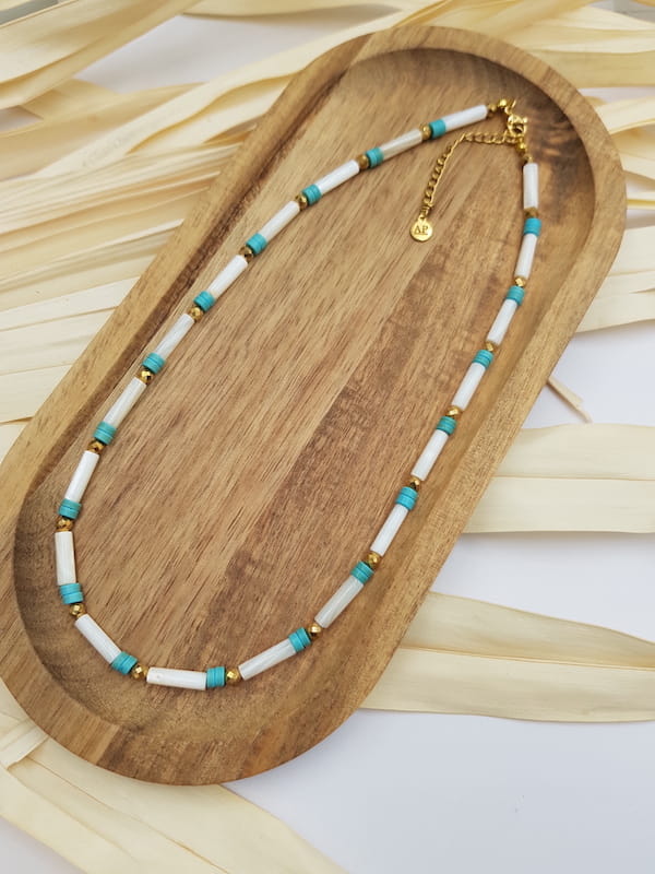 Naszyjnik z masy perłowej z turkusem to delikatna forma biżuterii inspirowana naturą i prostotą. Połączenie jasnej masy perłowej z turkusem nadaje całości świeżość i harmonię, dzięki czemu naszyjnik doskonale sprawdzi się zarówno na co dzień, jak i przy bardziej wyjątkowych okazjach.